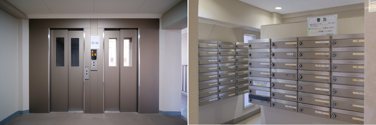 エレベーター(左)とメールボックス(右)