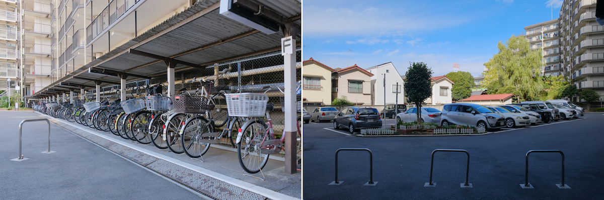 駐輪場(左)や駐車場(右)もとても広い。駐車場へ降りる階段にもスロープが併設されている