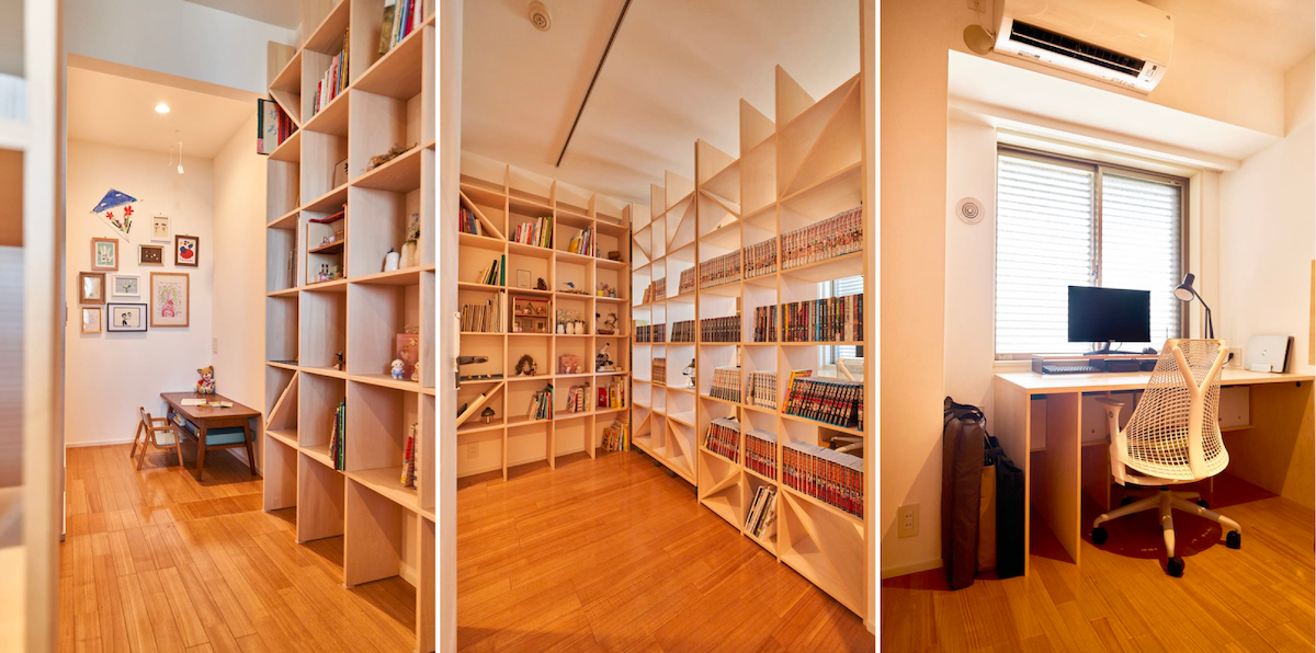 空間を効率よく仕切ることができる、可動式の造作本棚。大人の書斎と子どもの勉強机がちょうどいい距離感で隣り合うため、家族のコミュニケーションも大切にしながら在宅ワークが叶います。