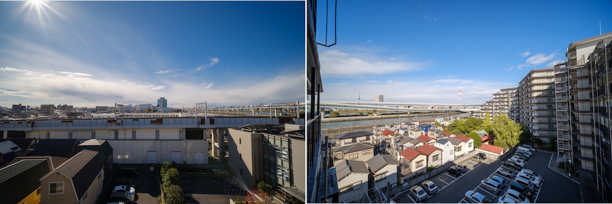 バルコニーからは180度に広がる空(左)。玄関側から北西方面には東京スカイツリーも見える