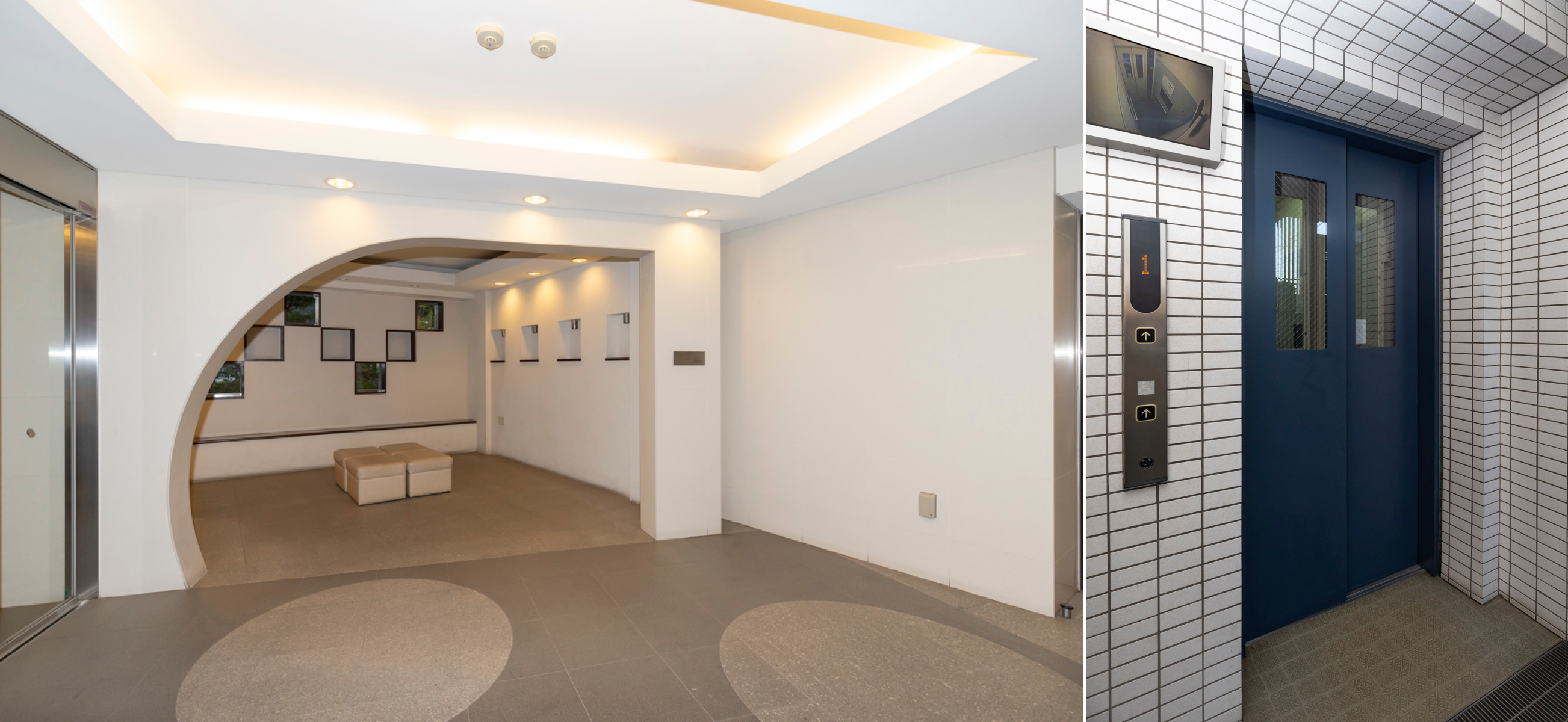 きれいに整えられているデザイン性の高いロビー。一階から確認できる監視カメラ付きのエレベーターで安心