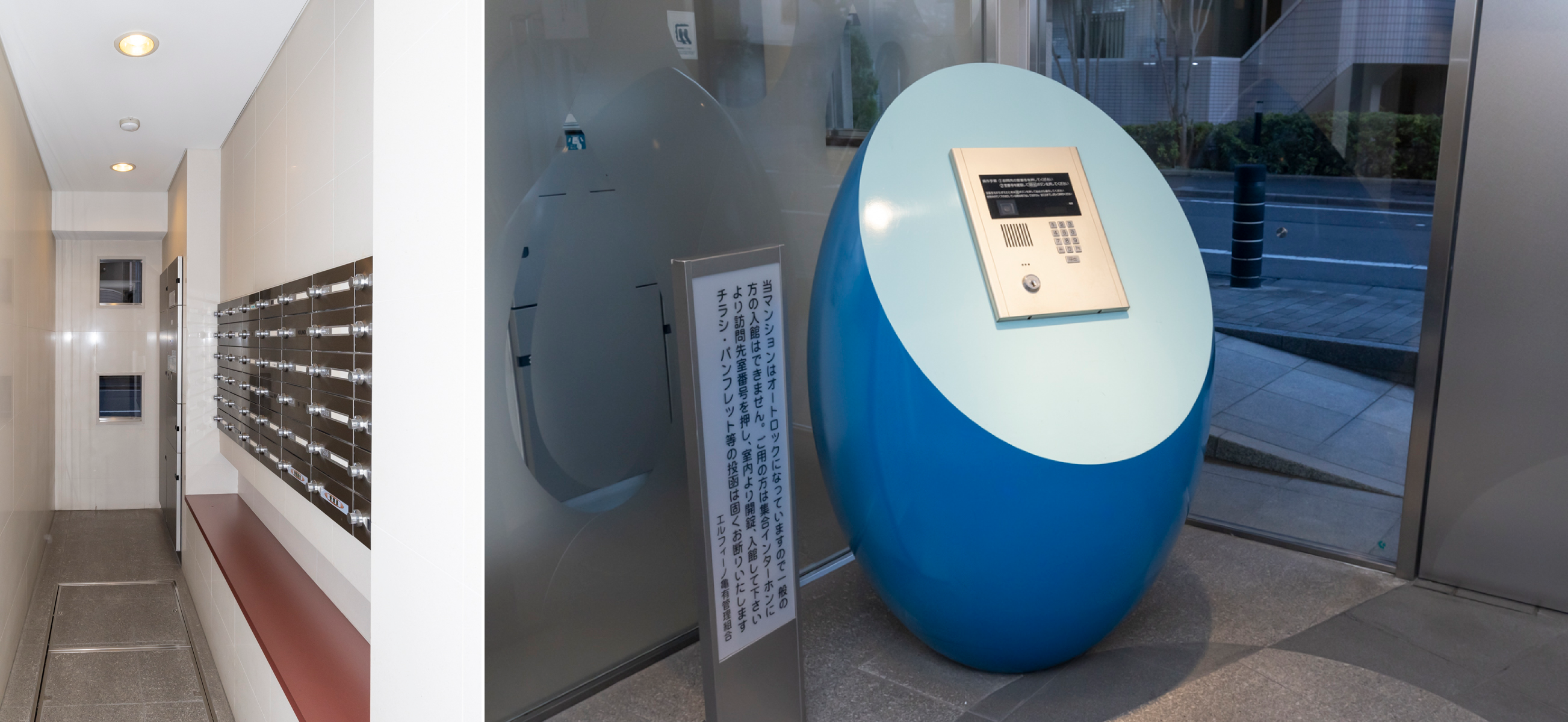 かわいらしいオブジェに備わったオートロック。不在時に便利な宅配ボックスも用意されている