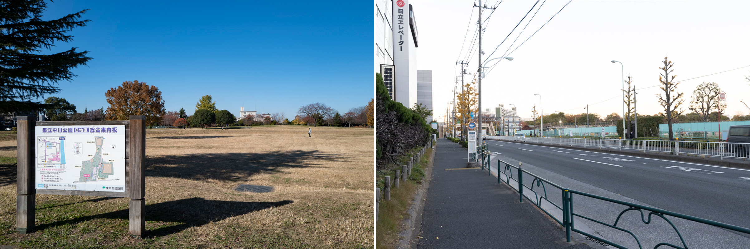 環状7号線がすぐ目の前だが、少し歩くと広々とした中川公園が。