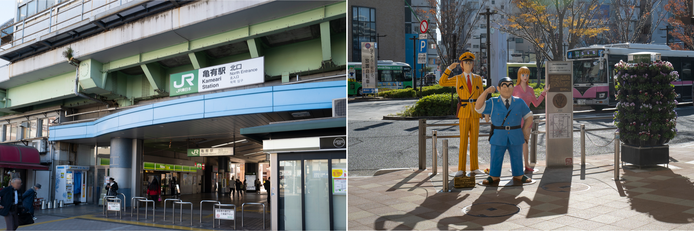 風情のある亀有駅。『こち亀』のキャラクターたちが出迎えてくれる