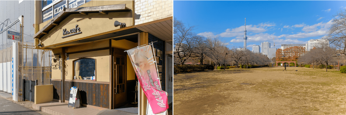 「Kn.cafe」(左)は自家焙煎コーヒーや自家製スイーツなども人気。住吉駅すぐの「猿江恩賜公園」(右)は芝生広場に桜の木が植えられ、春には東京スカイツリーと桜のコラボを楽しめる