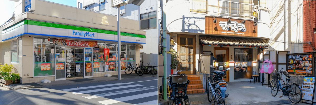 物件の最寄りコンビニは「ファミリーマート 大島中央銀座店」(左)。物件から徒歩3分の「ククク」は、本場の韓国料理が味わえると人気