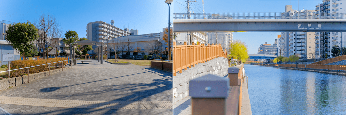 「大島四丁目公園」(左)は物件の玄関前から声が届くほどの近さ。小名木川の砂島橋(右)を渡って東に1.5キロほど歩けば、大型ショッピングモールの「アリオ北砂」がある