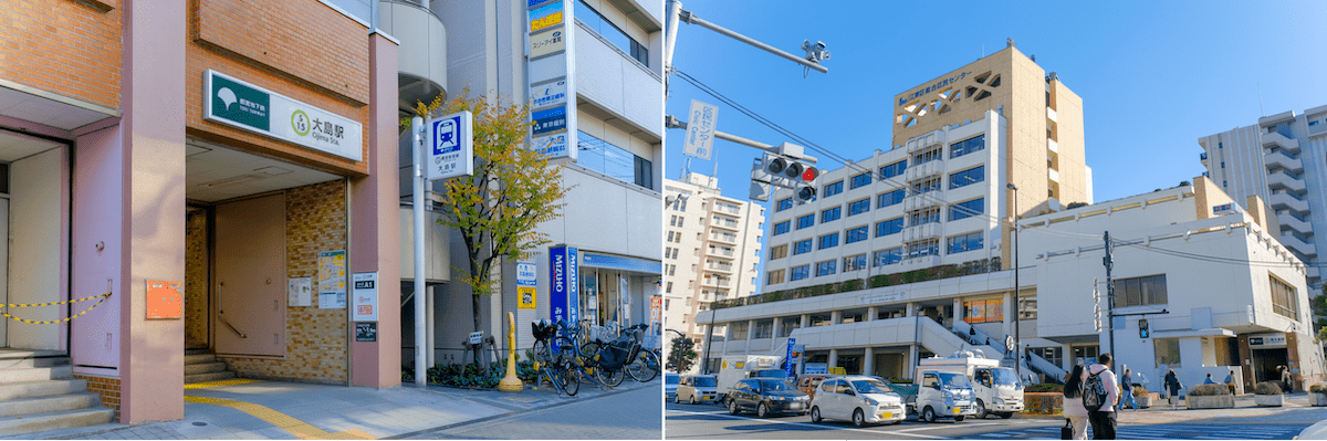 大島駅(左)と西大島駅(右)。西大島駅周辺には区民センターや都税事務所、郵便局などが集合している