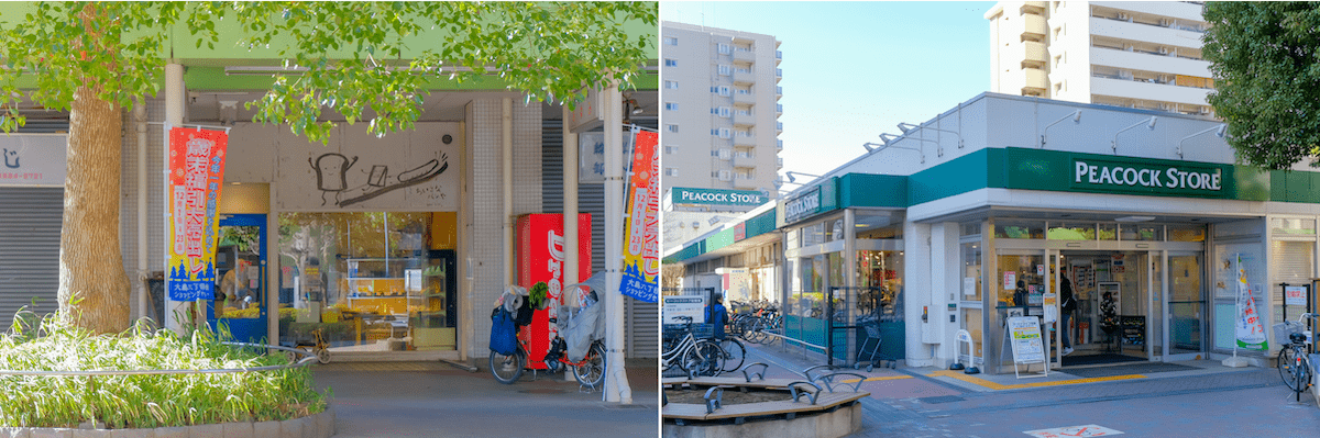 大島六丁目団地にある「ちいさなパンや」(左)と「ピーコックストア大島店」(右)。他にも、サイゼリヤやサイクルショップなど、生活に欠かせない店舗・サービスが揃う