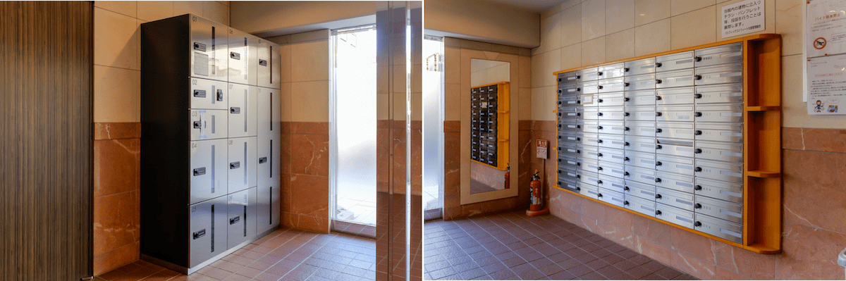 エントランス扉の内側すぐに宅配ボックス(左)とメールボックス(右)