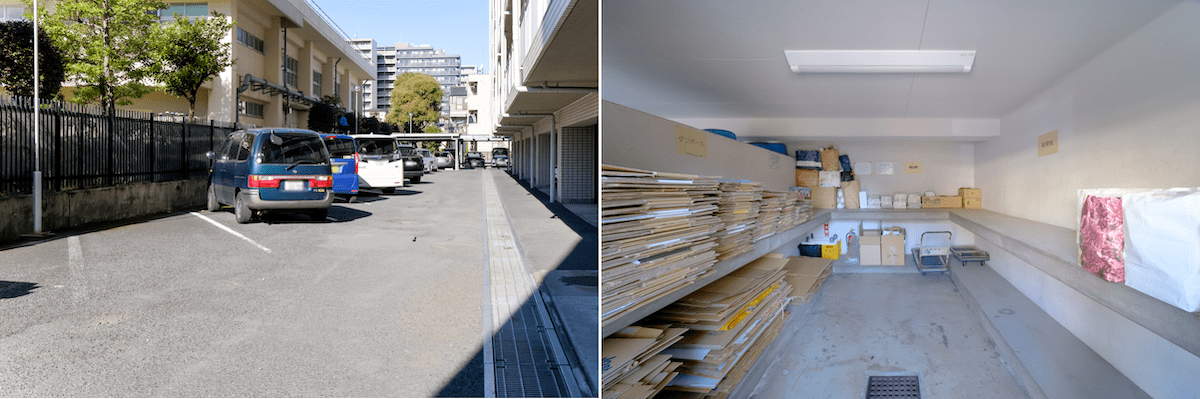 駐車場(左)とごみ置き場(右)。駐車区画は部屋ごとに場所が決まっている。駐車場の隣は小学校