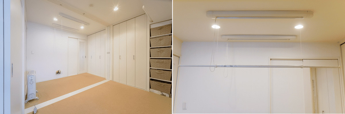 リビング横の部屋は元和室で、リフォームにより収納たっぷりの洋室になった。左写真奥側の天井には昇降式の室内物干しが設置され、室内中央の引き戸を閉め除湿機を置くことで簡易的な乾燥室として使える