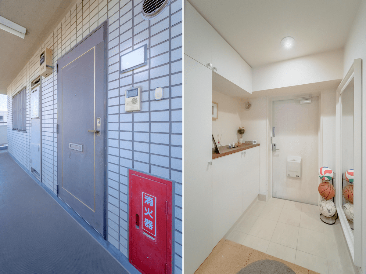 部屋のすぐ横にある階段を使えば駅までのアクセスが短縮できる。共用部も室内もきれいな状態。玄関も余裕のある広さで、ベビーカーでの出入りも問題なさそう