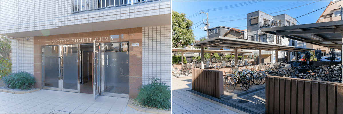 エントランス(左)と、その向かいの自転車置き場(右)