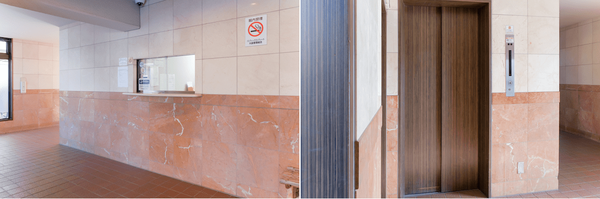 管理人室(左)の前を通り、奥まった場所にエレベーターがある(右)