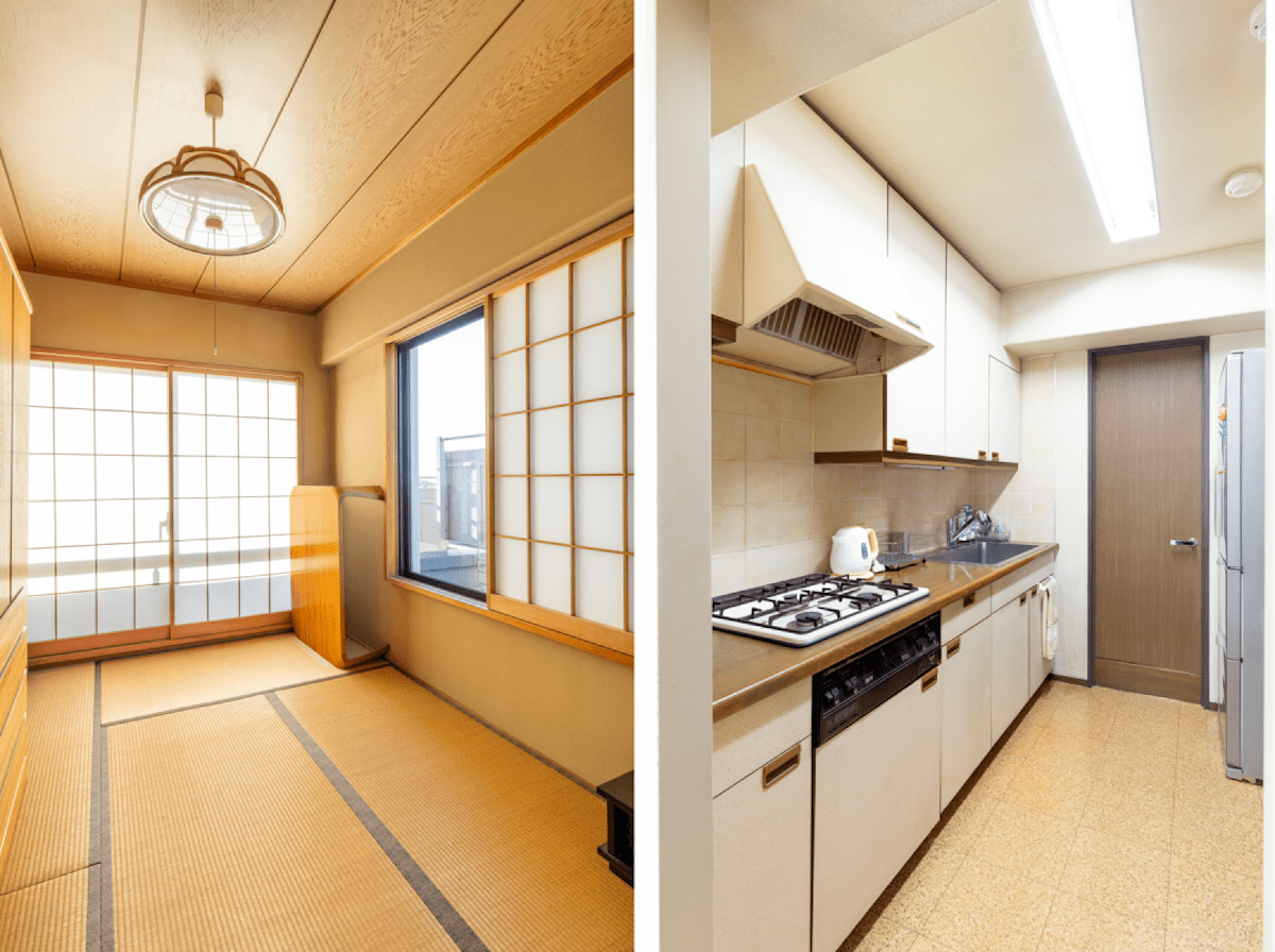 リビングと同様、南西向きの窓からしっかり光が入る明るい和室。キッチン奥の扉は脱衣所に繋がっており、家事をするにも便利な回遊動線になっている