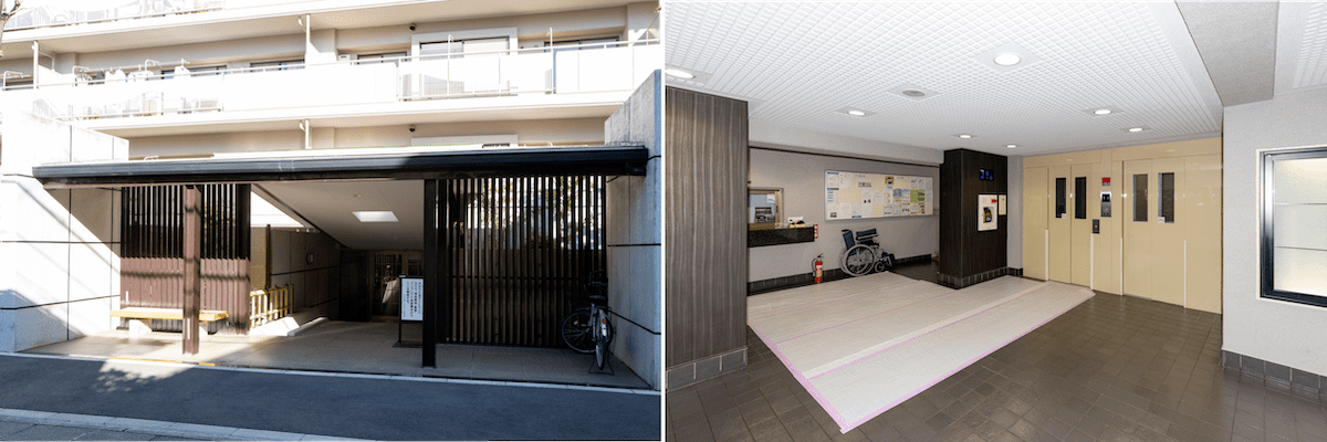 和の雰囲気漂うエントランス。ロビーはきれいに整えられている。エレベーターは新しく、2基設置されている