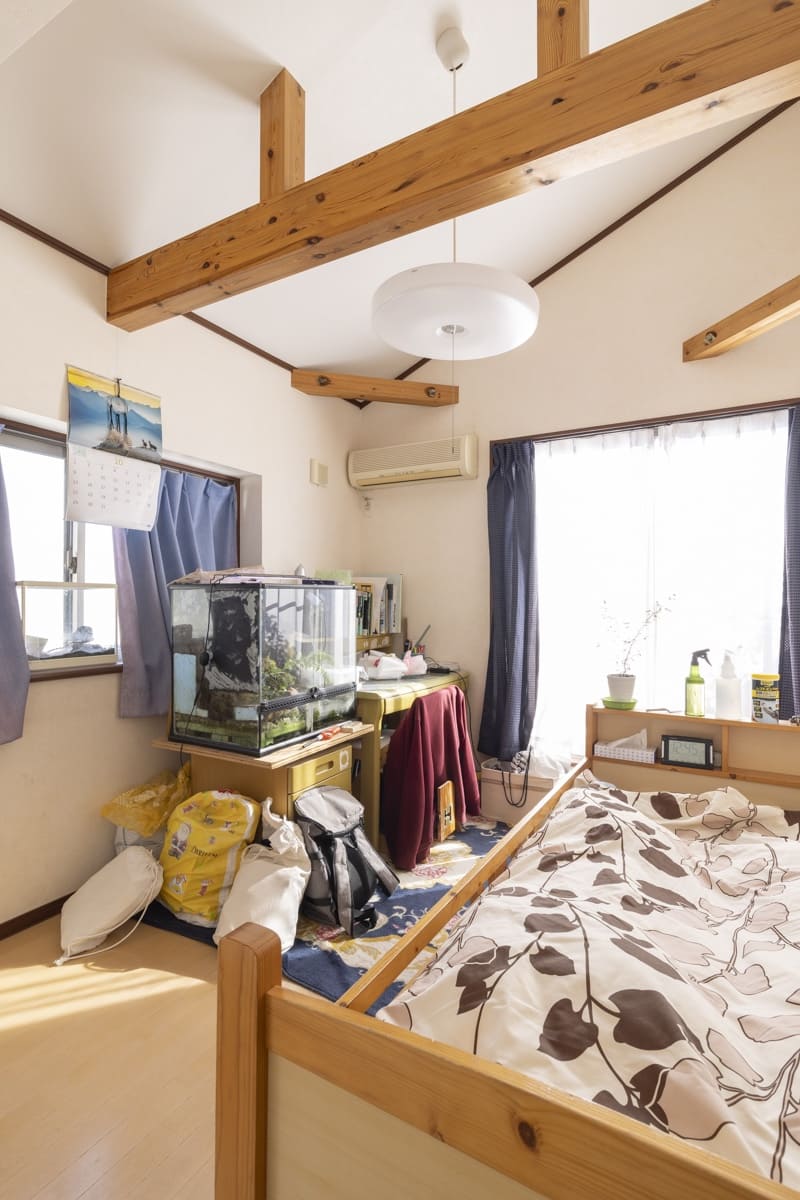 二階の3つの個室のうち、一つは家の形状に合わせて天井の高い構造