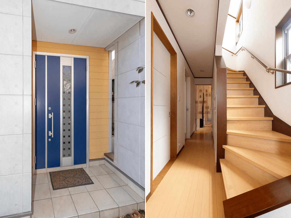 広い駐車場と庭付きでゆとりを感じるお家ですね。玄関を入ると二階へ続く階段が現れ、抜けの良い空間が広がっているのも好印象です。