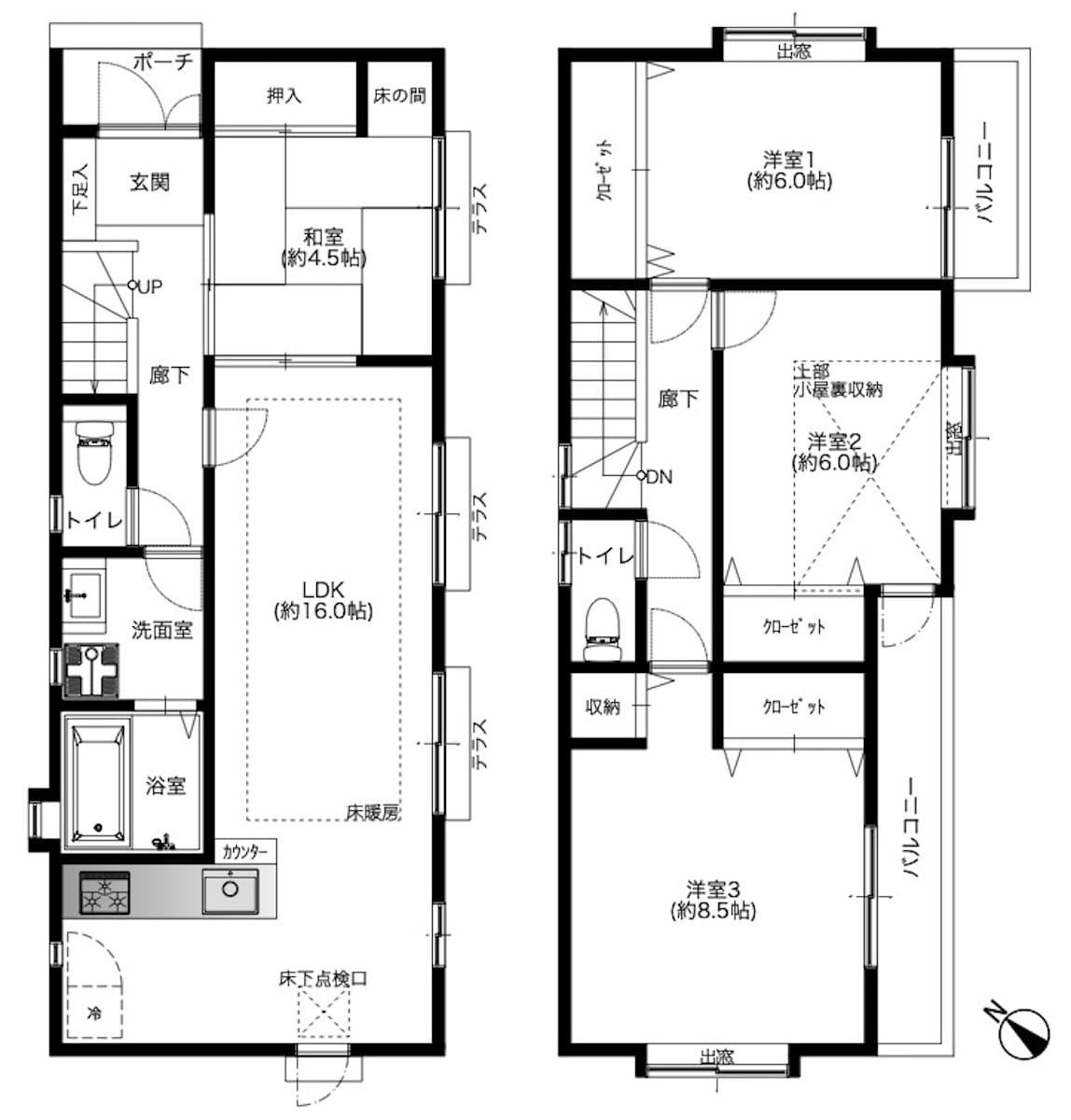 南西向きで午後にかけて日当たりがよくなります。2階は特に明るいですね。押入れ、クロゼットのほか屋根裏収納も備わっているので、収納力も高いと思います。