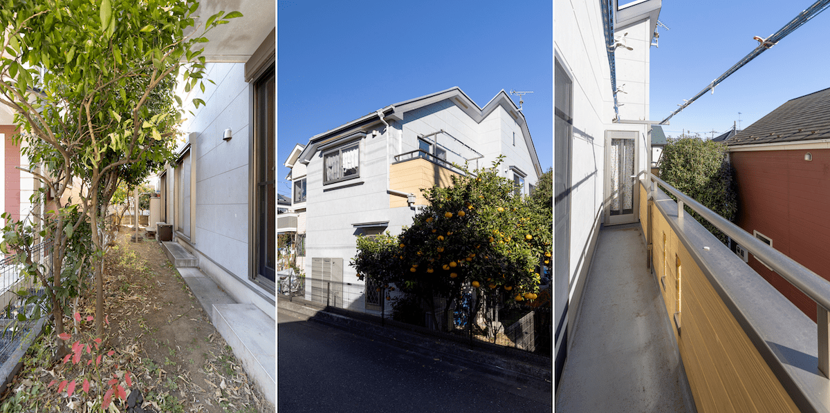 庭には立派なみかんの木。二階のベランダには2つの個室からアクセスできて、布団を干すときにも便利