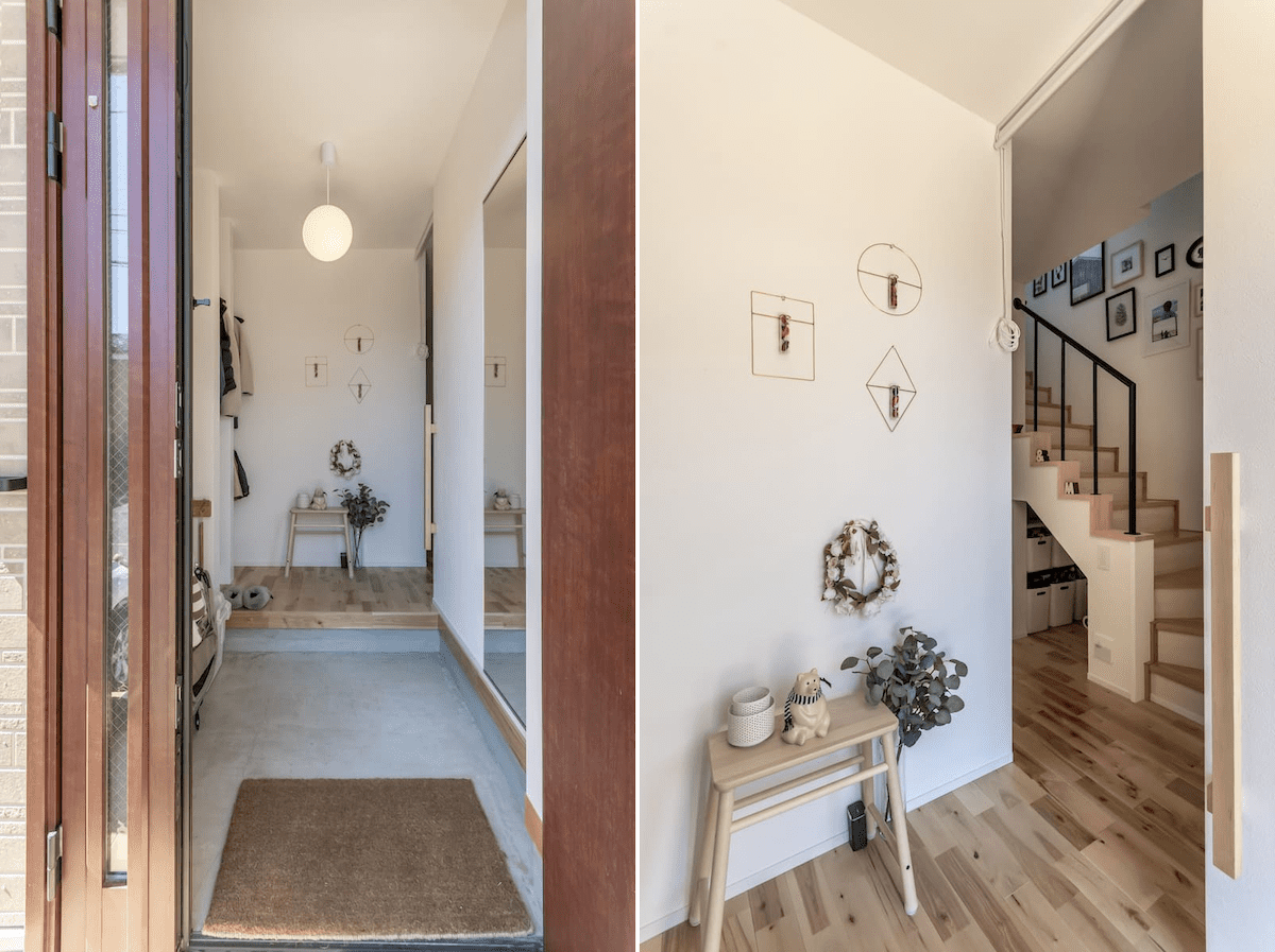 コンパクトな玄関横に併設する階段は、手すりをアイアンなどの抜ける素材にすることで圧迫感が軽減しますよ。