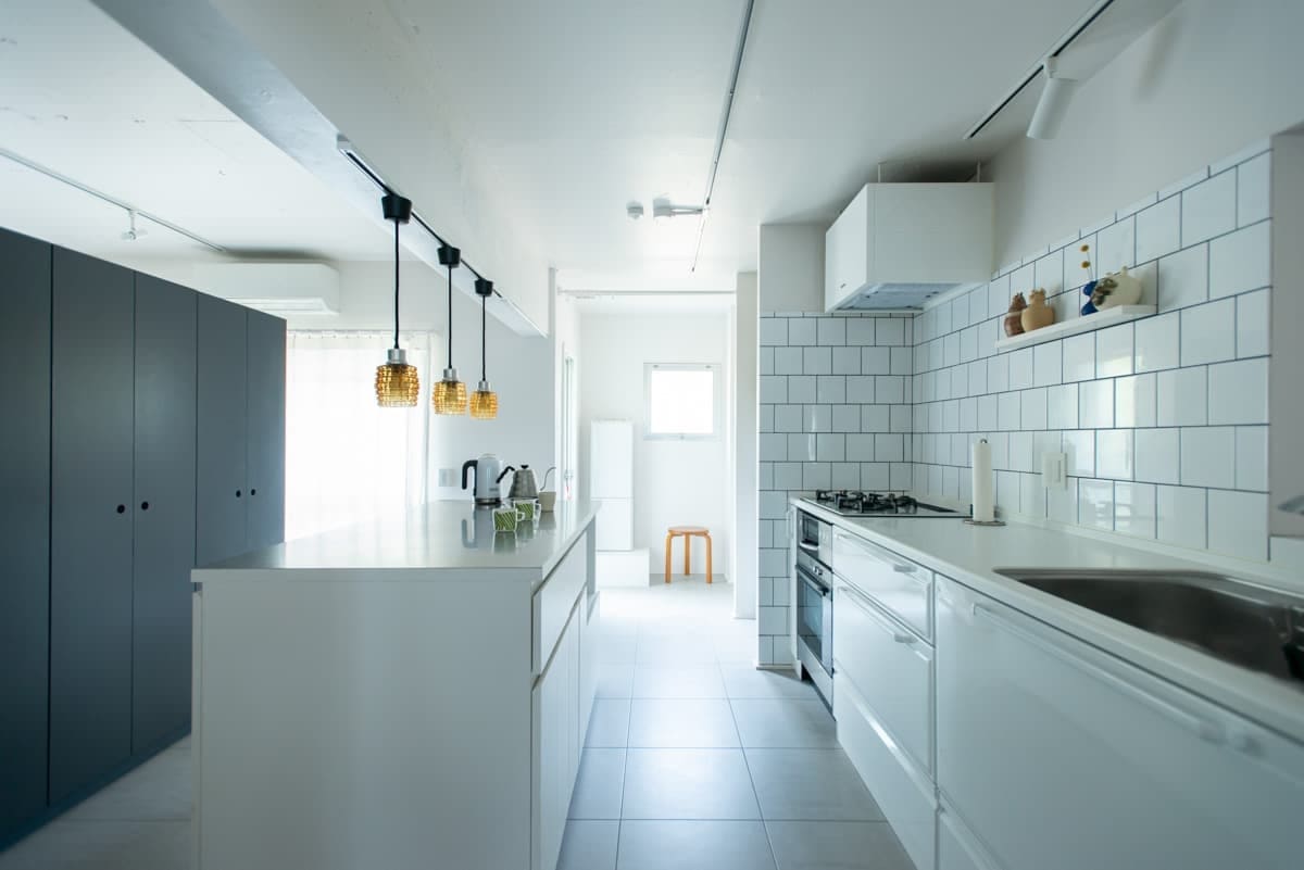 間口の狭いお部屋には壁付けキッチンがオススメ。キッチンをコンパクトにするとリビングダイニングが広く使えますよ