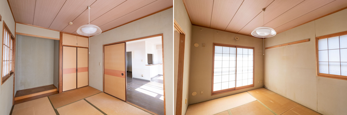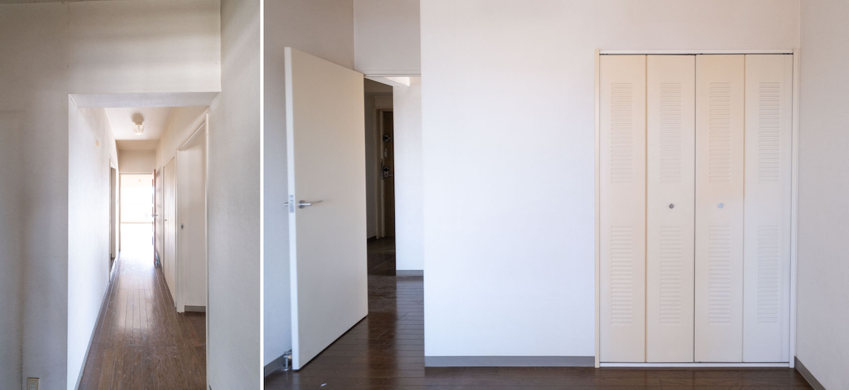 (左)廊下からバルコニーを眺めた景色。構造壁を活かし、あえて天井を下げるリノベも面白そうだ。(右)中央の洋室にはクロゼットも備わっている