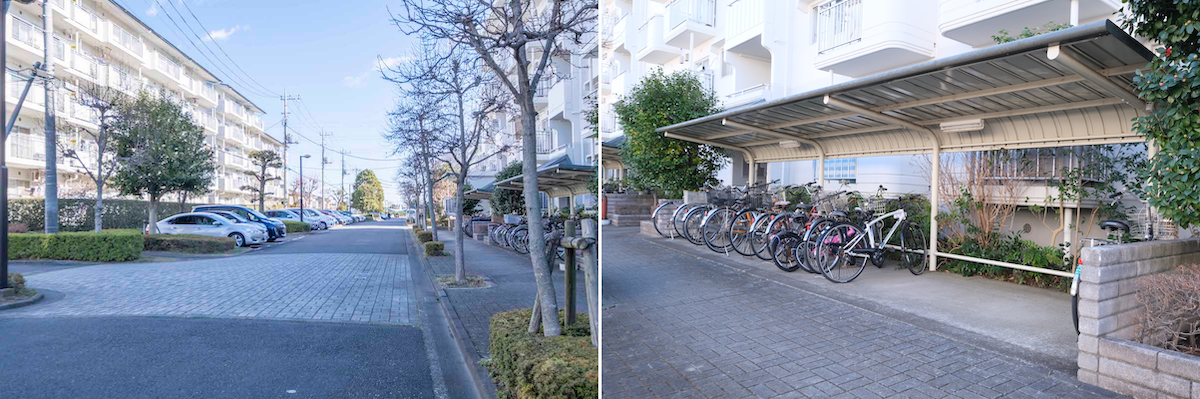 敷地内の駐車場と駐輪場。道幅が広く移動しやすそう