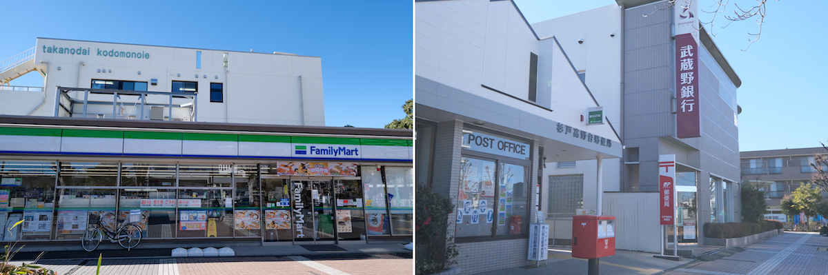 西口にはコンビニや郵便局、銀行などが揃う。駅前に保育園があるのも子育て世帯には嬉しいポイント