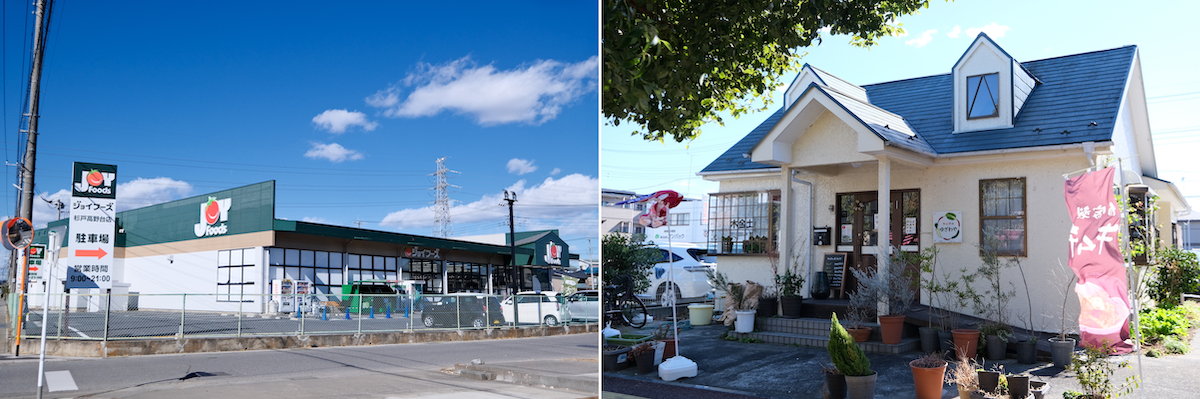 最寄りスーパーのジョイフーズ杉戸高野台店(左)。駅前の韓国料理店キムチのゆざわや(右)は本格的なメニューがテイクアウトできる