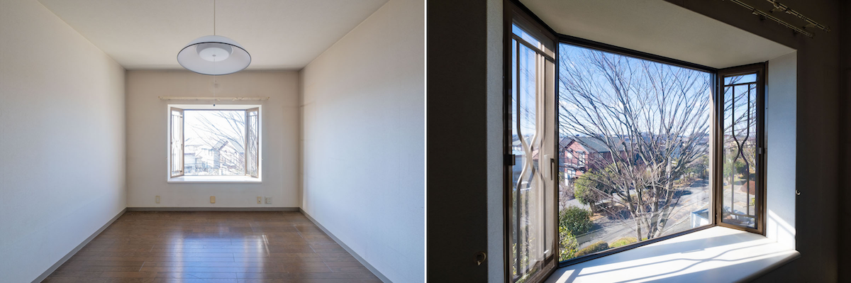 出窓のある中央の洋室。目の前には大きな街路樹があり、小鳥のさえずりが心地よかった
