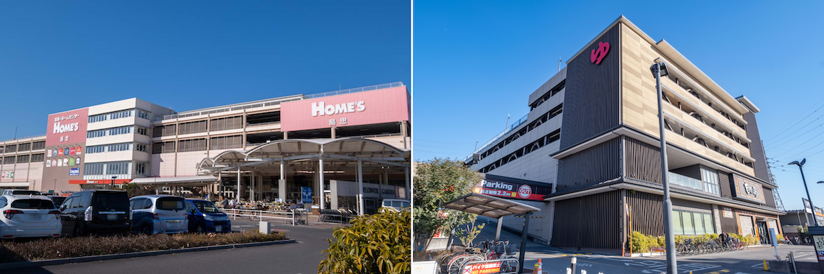 何でも揃う島忠ホームズ草加舎人店(左)。人気のスーパー銭湯もほど近く、リフレッシュにもってこいだ