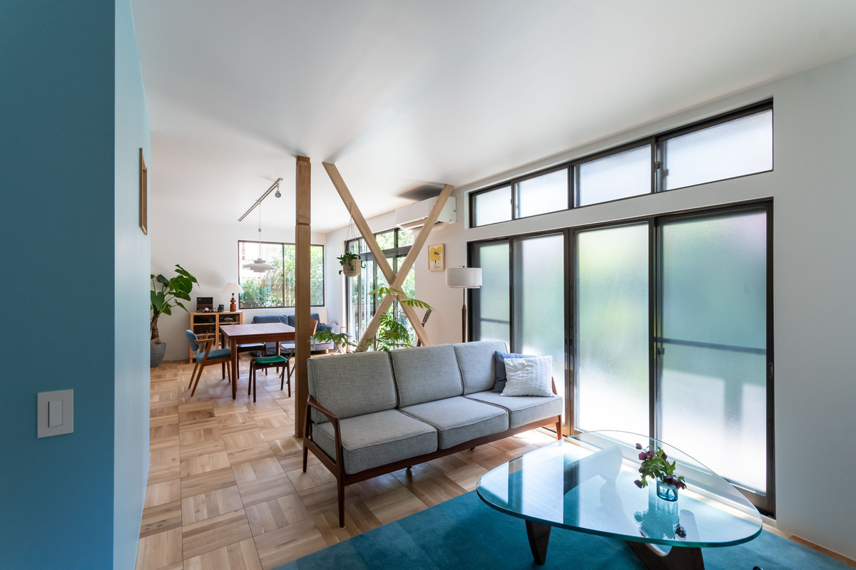 今のままでも十分すてきなLDKですが、家具が好きならこんなリノベもおすすめ。ナチュラルで個性のあるパーケットフローリングで、主役の家具を引き立てます。家具の色味に合わせたアクセントウォールもおすすめですよ。