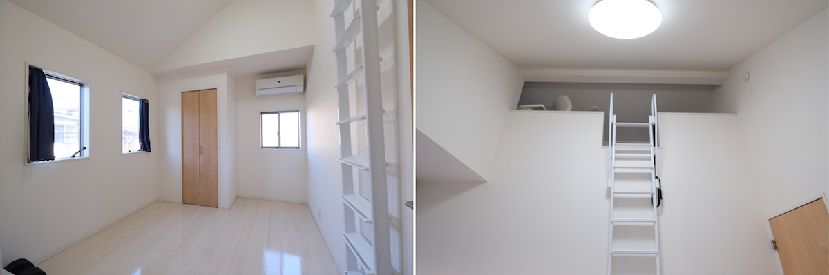 道路に面した洋室はロフト付きで天井も高く、開放感がある