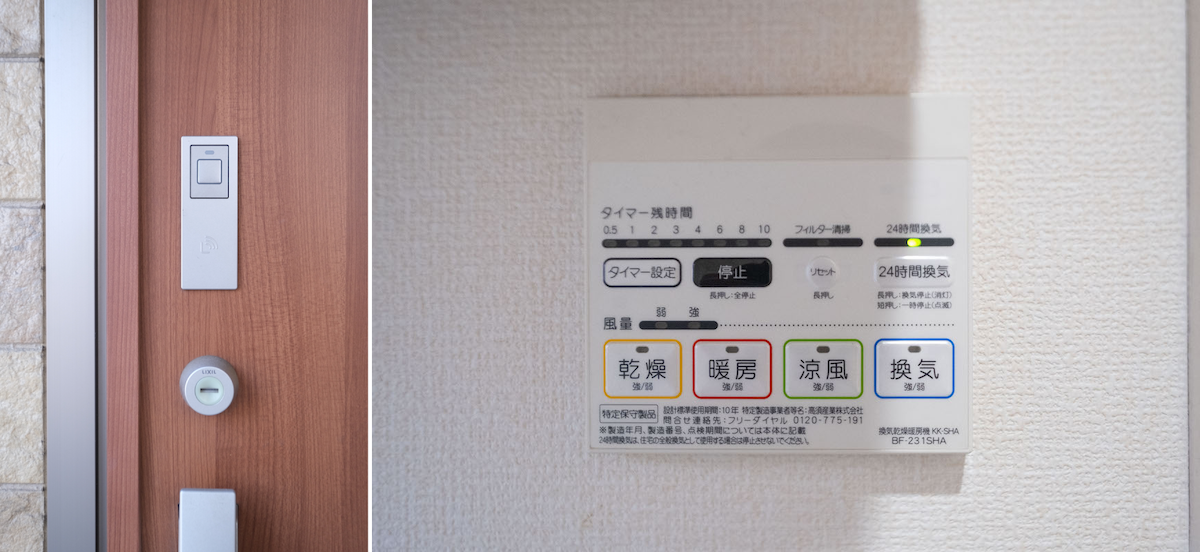 玄関ドアはダブルロックでタッチキー機能つき。浴室は暖房も使える乾燥機つきなのが嬉しいポイント