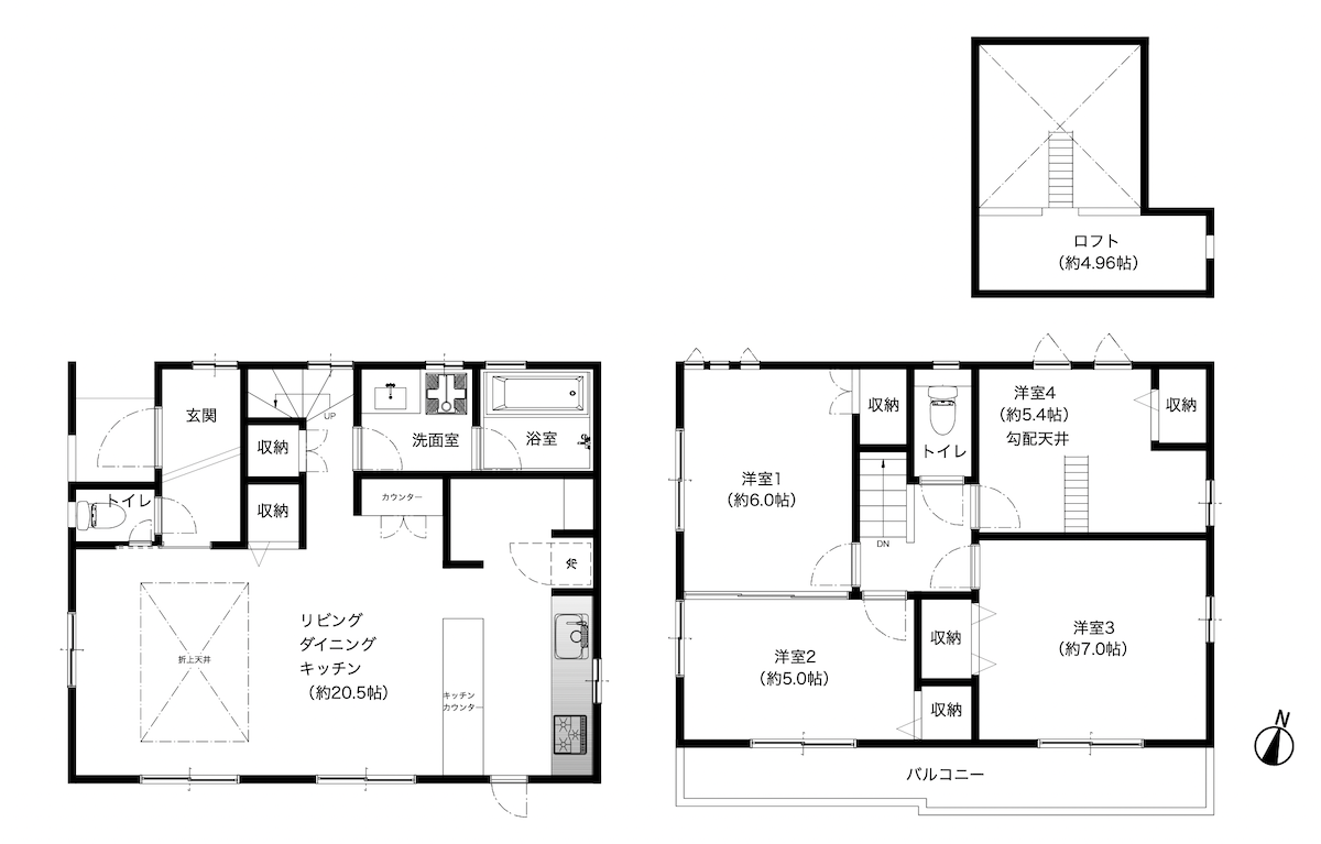 建物面積98.12㎡。1階は20帖のLDKがあり、2階には個室が4部屋の間取り