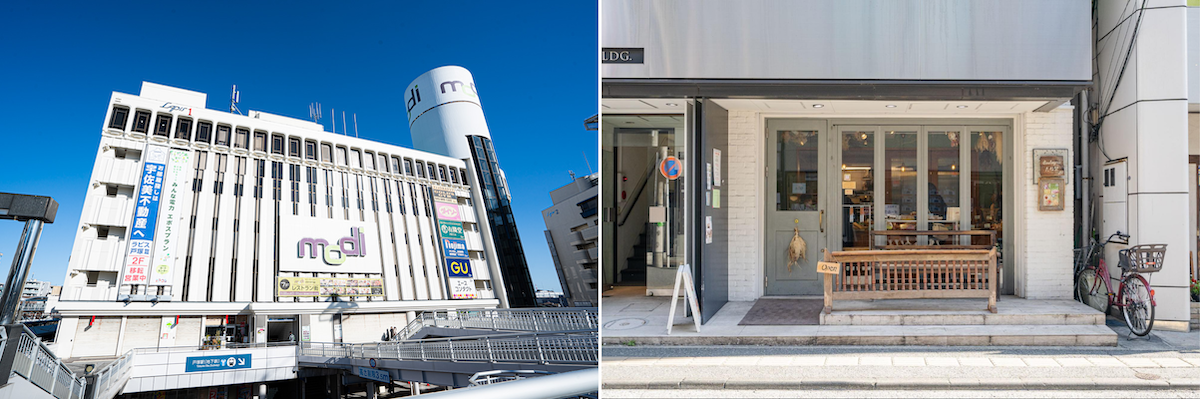 東口にあるモディ(左)と西口の商店街にあるベーカリー
