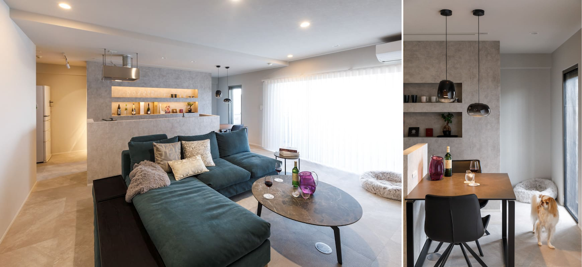 リノベでホテルライクなデザインに変更することもできます。モルタル調のアクセントウォールを使用することで、グレー基調の大人空間にも遊び心が生まれます。また、床材をペットの足元に優しい商品に変更するのもおすすめです。