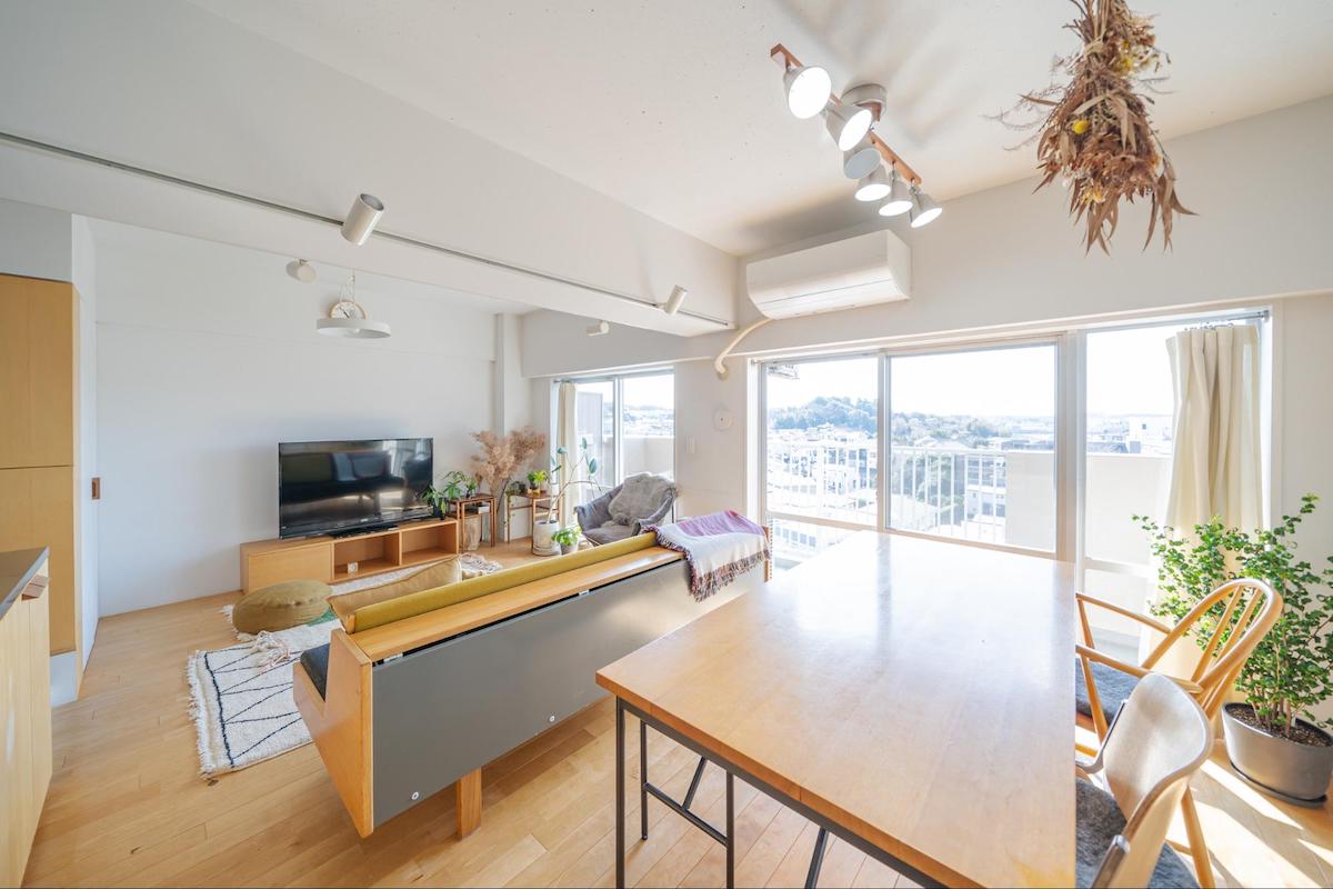 もともと和室があった場所をフローリングにしてリビングと一体化させ、大きく寛ぎやすい空間に変えました。日当たりが良いので、冬でも暖房をあまりつけなくても快適に過ごせますよ。