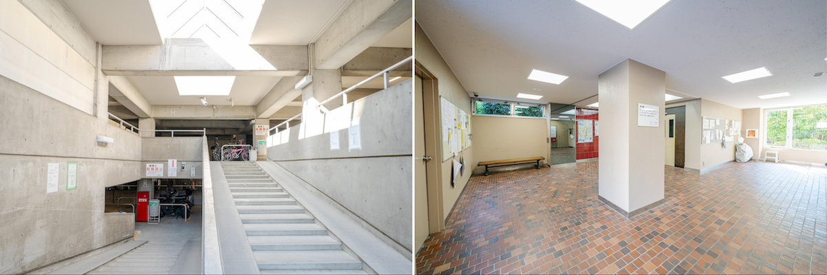 駐輪場(左)とエントランス(右)も世帯数に合わせたゆとりのあるつくり