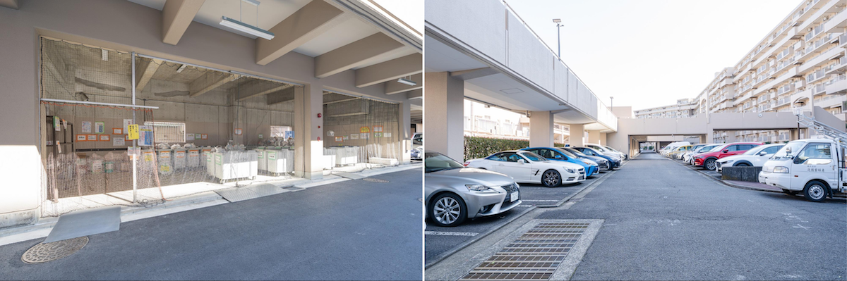 大規模な駐車場も完備。ゴミ捨て場もしっかりと清掃されている
