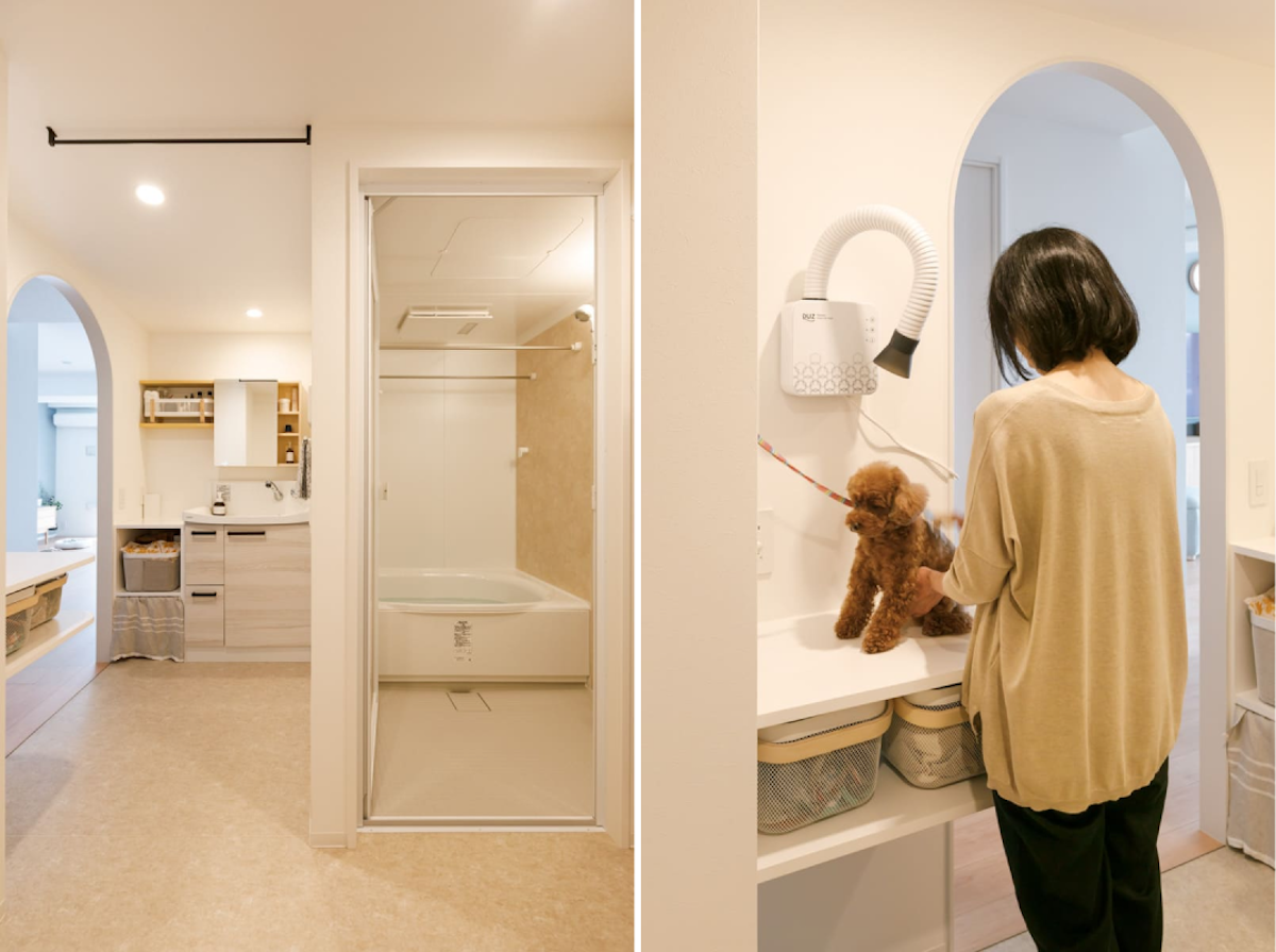 既存設備を活かしたリノベで、欲しい設備をプラスするのもおすすめ。写真のように、愛犬のお世話に便利な台を造作することもできますよ。