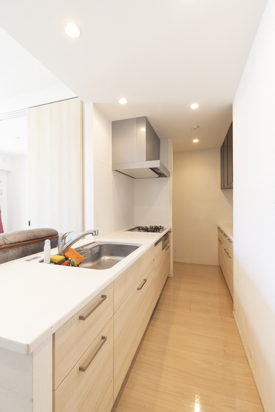 対面キッチンを活かしつつ、アイランド型にすることで作業性がUP。窓の外を眺めながら作業ができ、気持ちがよさそうです。