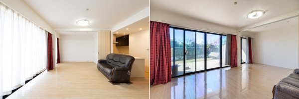 天井が高く、奥の個室の仕切りをなくせば20帖の広大なリビングに。カーテンを開ければ庭を一望できて、なかなかない開放感を味わうことができる
