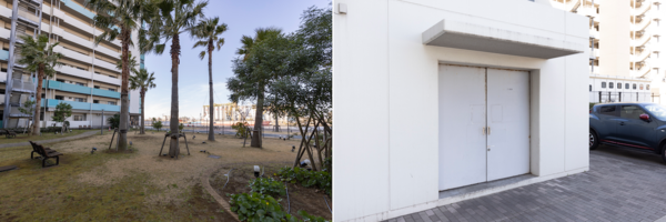 さんばしひろばまで行かなくてもオーシャンビューが楽しめる共用の中庭。ゴミ捨ては24時間OK