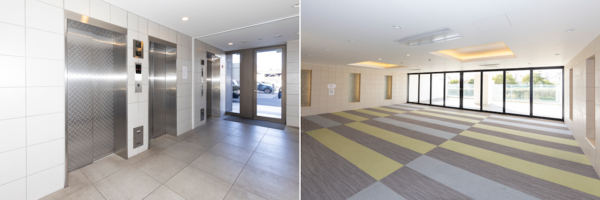 エレベータは2基。カーペットが敷かれた広大な共用スペースも