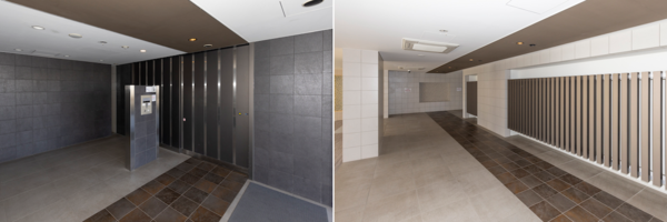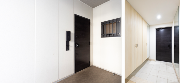 玄関の左右に空間が分かれる物件。床材を大胆に変えることで、気持ちに変化をもたらします。