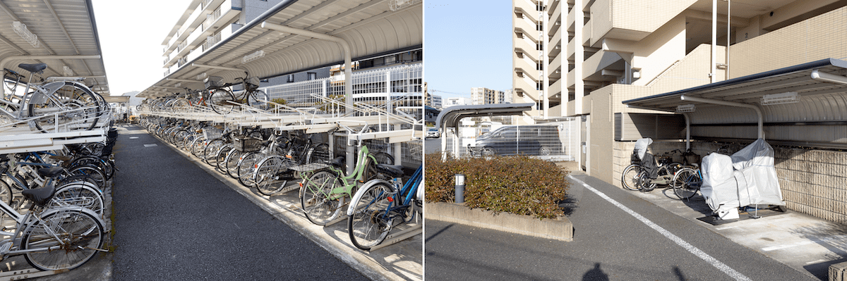 駐輪場と駐車場のスペースは豊富。駐車場は機械式