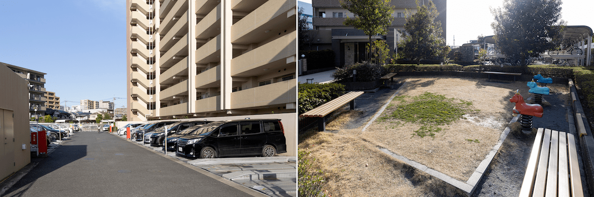 バイク置き場も用意されている。エントランス付近には子供と遊べるちょっとした遊戯スペースも用意されている